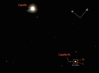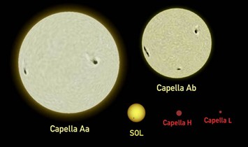 Porównanie rozmiarów obu par składników Capelli (głównej – Aa i Ab i mniejszej karłowatej, Capelli H i Capelli L. NA rysunku umieszczono też słońce (SOL). Źródło: Wikipedia, Sky&Telescope.