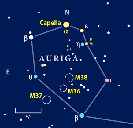 Amatorskie ujęcie składników Capelli daje wyobrażenie o jej rozmieszczeniu na niebie. Źródło: Giorgio Rizzarelli.