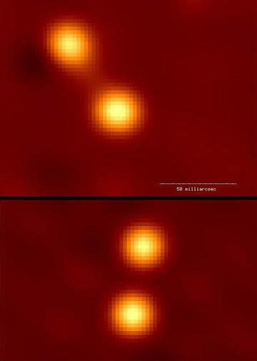 Wykonane w odstępie czasowym 14 dni dwa zdjęcia Capelli przy pomocy teleskopu COAST. Odległość kątowa między składnikami to zaledwie 0.05”. Źródło: MRAO and Cavendish Astrophysics.