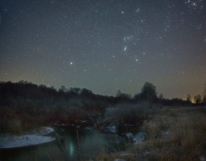 Gwiazdozbiór Oriona i po lewej od niego, Syriusz (nad lasem) w ujęciu Aleksandra Yuserewa (Nowosybirsk, Rosja), Źródło: Sky & Telescope.