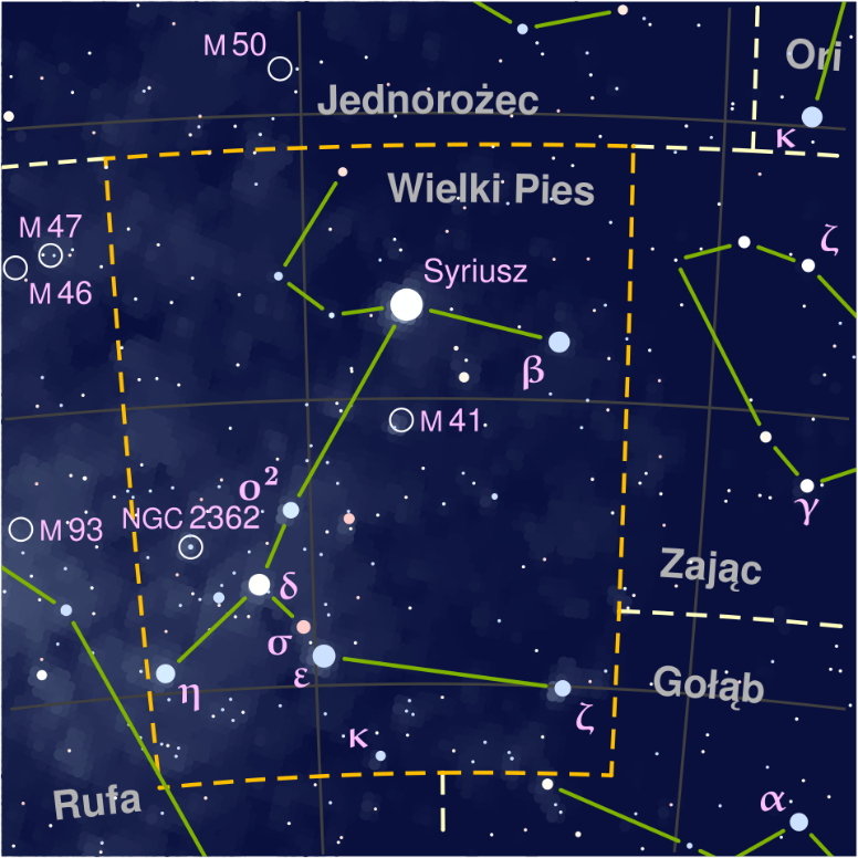 Gwiazdozbiór Wielkiego Psa (Canis Maior) z zaznaczoną pozycją Syriusza. Źródło: Szczureq, program PP3 autorstwa Torsena Brongha, Wikipedia.
