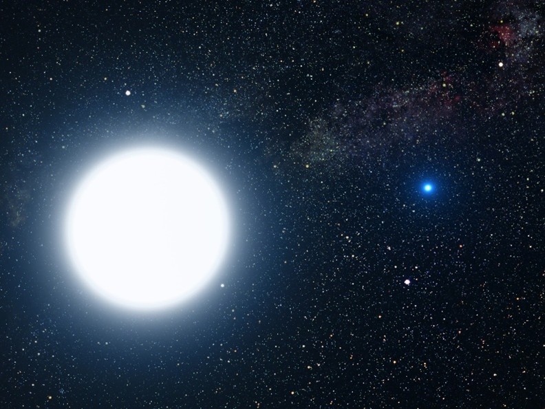 Wyobrażenie artystyczne Syriusza A i B w przestrzeni kosmicznej. Źródło: NASA, ESA i G. Bacon (STScl).