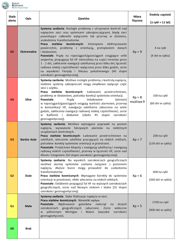 Jedna ze skal intensywności wiatru słonecznego – skala G (geomagnetyczna). Przedstawia efekty oddziaływania na ziemską magnetosferę i jonosferę. Źródło: IMGW-PIB, NOAA.