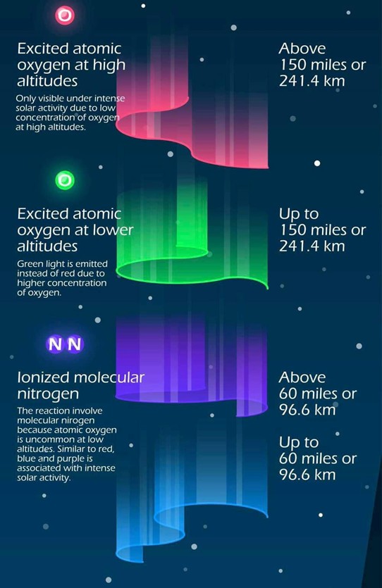 Kolory zorzy w zależności od pierwiastka chemicznego w atmosferze oraz wysokości, na której zachodzi wzbudzenie. Źródło: Maciej Kawecki.