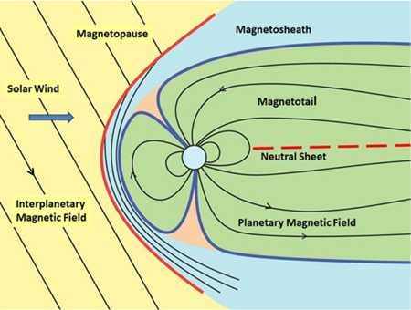 Schemat przekroju przez magnetosferę Ziemi. Czerwona linia to łukowata fala uderzeniowa (bow shock), niebieski obszar – powierzchnia prądowa (magnetosheath), ziemska magnetosfera i ogon magnetosfery – na zielono. Źródło: Rajkumar Hajra, Space Plasma Physics.
