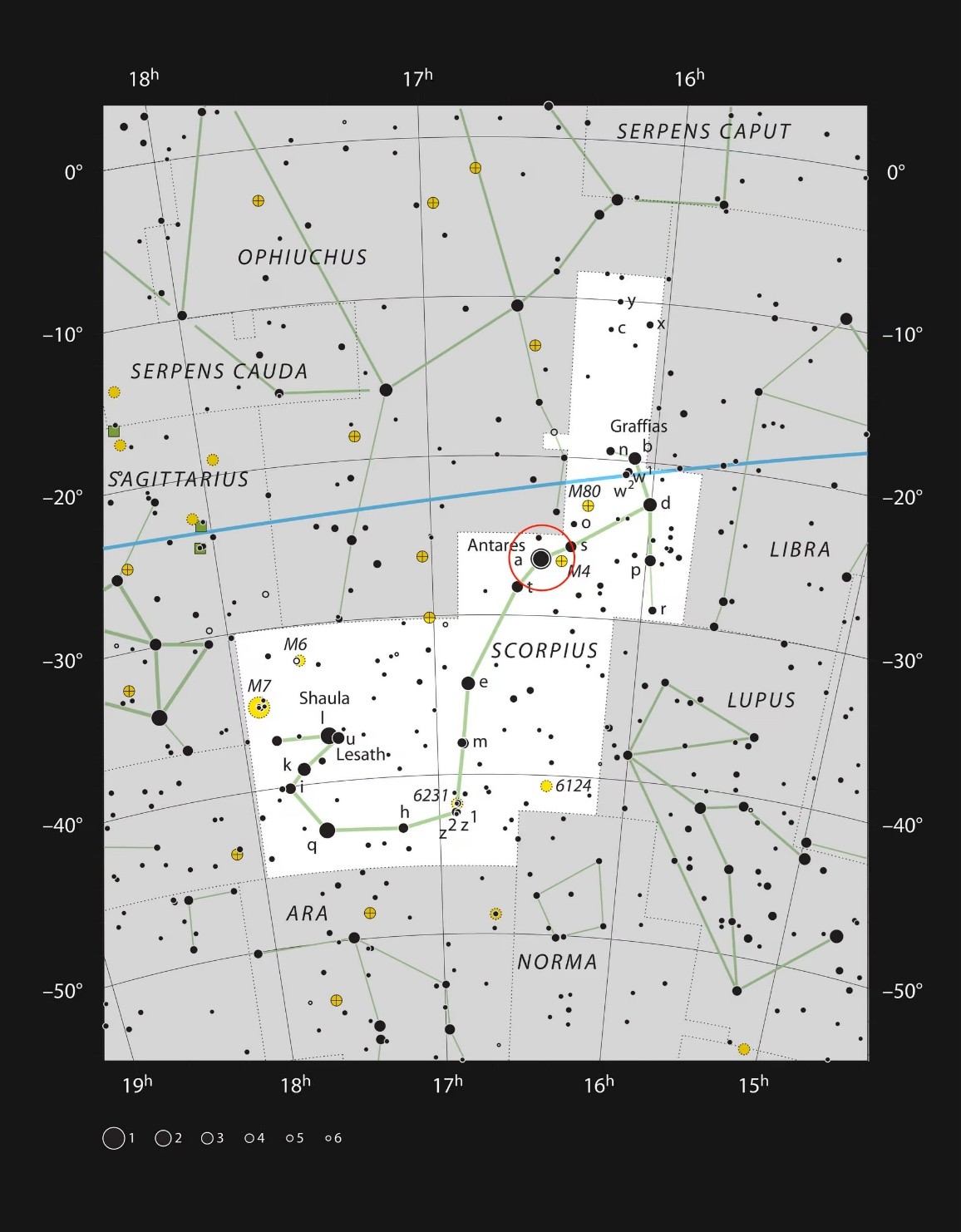 Mapa gwiazdozbioru Skorpiona z zaznaczonym (czerwonym okręgiem) Antaresem. Źródło: IAU/Sky&Telescope/ESO.