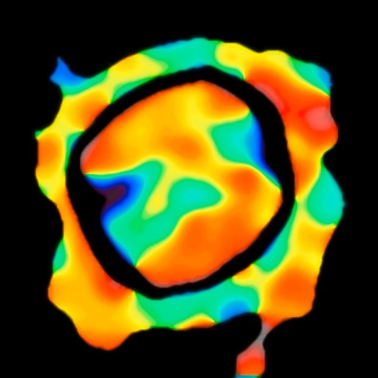 Obraz interferometryczny Antaresa z VLTI. Czerwone fragmenty powierzchni się oddalają, niebieskie – przybliżają. Okręgiem oznaczono rejony, dla których pomiar był niemożliwy. Źródło: K, Ohnaka/ESO.