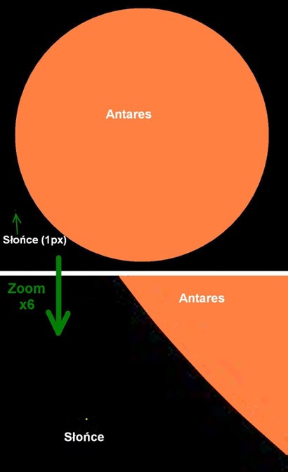 Porównanie rozmiarów Antaresa i Słońca w dwóch przybliżeniach. Źródło: Doxcent, praca własna – wikipedia.