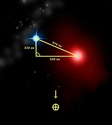 Ujęcie Antaresa A (z prawej) i B (z lewej) na ziemskim niebie, z zaznaczonym kierunkiem na Ziemię i fizyczną odległością między składnikami – 574 AU. Źródło: Doxcent – praca własna, wikipedia.